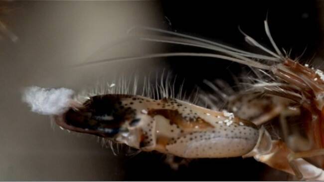No te dejes engañar por su pequeño tamaño: este camarón tiene puño infernal. A pesar de tener 2,5 cm de largo, esta criatura puede emitir un increíble sonido de 218 decibelios (más fuerte que un golpe), juntando sus garras. Esto provoca un punto caliente corto de 5000k, un destello de luz y una onda de choque que los camarones usan para aturdir, matar a la presa o romper la cáscara.