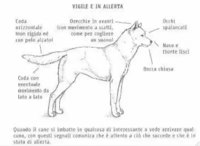 CAÑA: Boca cerrada, dientes y lengua no visibles, cabeza y orejas inclinadas hacia adelante, pupilas dilatadas, cola horizontal no rígida, cuerpo alineado y cabeza levantada.