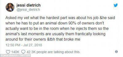 “Le pregunté a mi veterinario cuál cree que es la parte más difícil de su trabajo y me respondió que es cuando tiene que practicar la eutanasia, pero en el 90% de los casos los propietarios deciden no asistir. Los últimos momentos de los animales en este caso consisten en buscar a su amo y esto me mata ”.