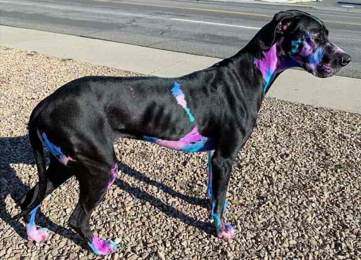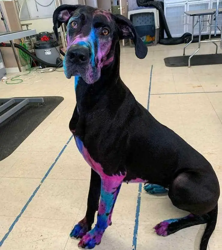 Un peluquero decidió teñir a su perro con colores vegetales para hacerlo más amigable dado su enorme tamaño y reveló que muchas personas al verlo le preguntaron si el perro era de una nueva raza derivada de una cría selectiva a lo que ella respondía que sí. él es un Galaxy Dane.