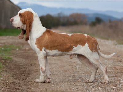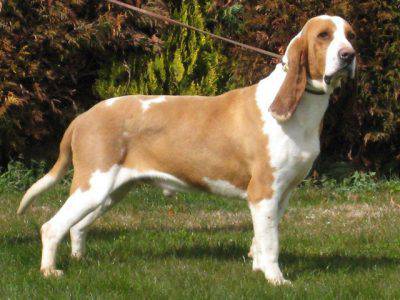 Es un perro de tamaño mediano, bien proporcionado y de extremidades largas, con una hermosa cabeza y orejas largas. Destaca el desarrollo del perímetro torácico y la longitud del cuerpo, mucho mayor (de 710 cm) que la altura a la cruz. La cabeza es larga pero armoniosa, proporcionada al cuerpo. Los ojos son almendrados, de color avellana oscuro: la mirada es triste, digna, inteligente. Las orejas son grandes, largas y caídas: de forma rectangular, tienen puntas redondeadas y cuelgan libremente en «sacacorchos»; sin tirar de ellos, deben exceder ampliamente la nariz. El hueso es compacto, las extremidades robustas. La cola, insertada a mediana altura, es muy gruesa en la raíz: bajada supera el corvejón. Cabello: grueso, corto y fino. Color: blanco y naranja, con predominio de uno u otro, distribuidos en manchas irregulares con bordes bien definidos y sin rayones. El naranja puede variar desde tonos más claros (limón) hasta marrón rojizo intenso. Tamaño: machos 52-57 cm; hembras 48-53 cm (con una tolerancia de un cm más o menos para ambos).