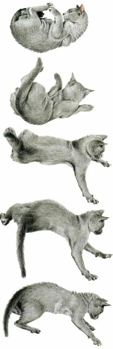 Los músculos elásticos y la columna flexible del gato le permiten acurrucarse y rotar su cuerpo 180 grados cuando está en el aire. Esta flexibilidad le permite realizar muchos movimientos. Cuando el gato salta, le da el impulso con las patas traseras, arquea la espalda y luego aterriza con las patas delanteras sobre la presa. Los músculos alrededor de la muñeca, muy ágiles, te permiten rotar la pierna para agarrar efectivamente a la presa. Antes de cada salto o movimiento, el gato calcula con precisión la distancia y la fuerza necesarias. Estos movimientos improvisados son diferentes cuando el gato caza o es cazado, al igual que lo son cuando el gato se asusta, en cuyo caso el gato salta con las cuatro patas al mismo tiempo.