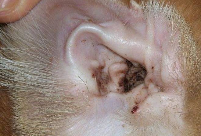 La oreja está hinchada y enrojecida con costras negras o marrones. Los ácaros aparecen como pequeños puntos blancos. El ácaro Otodectes Cynotis también provoca una formación excesiva de cerumen.