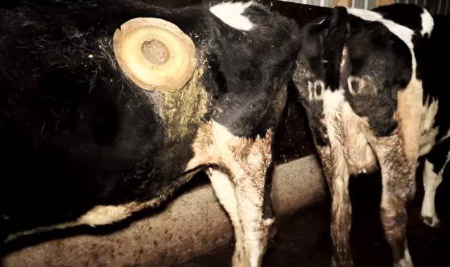 “Esta investigación muestra el procedimiento que se aplica a las vacas, la fistulación, con la cual se hace un agujero de 15 cm de diámetro en el estómago de las vacas para estudiar su digestión. Se ven obligados a vivir en un cobertizo de cemento, en una caja estrecha sin heno, entre sus excrementos. En otro galpón, las gallinas, en cambio, no pueden pararse porque crecen rápido y no forman músculos ”, informa L214.
