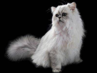 De aspecto más delicado que el típico persa, la chinchilla en realidad tiene un cuerpo fuerte y robusto, como lo demuestra esta típica pose juguetona. Variedad más difícil de obtener: el estándar exige una coloración intensa y marcada de las puntas, lo que le da al pelaje un matiz particular en el hocico, los costados y la cola. El brillo particular del pelaje, que recuerda al del metal precioso, ha llevado a que la raza sea apodada Persa de plata (Plata persa).