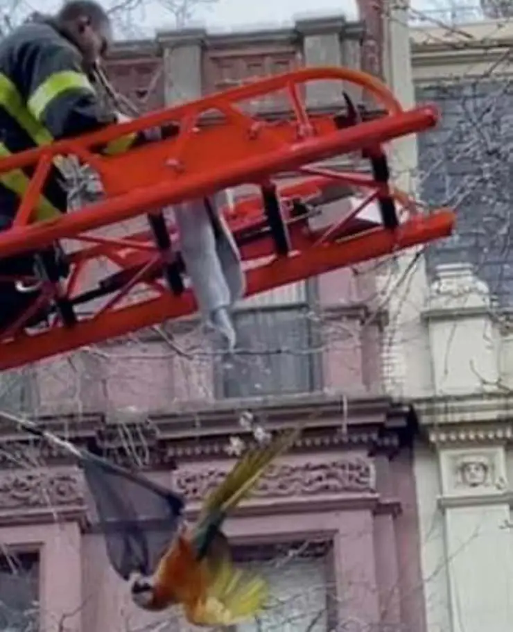 Los luchadores con una escalera muy larga llegaron al árbol en el que se había posado el pajarito para sentirse a salvo. Los agentes después de varios intentos finalmente lograron capturar al guacamayo con una red que fue devuelto ileso a su legítimo propietario.